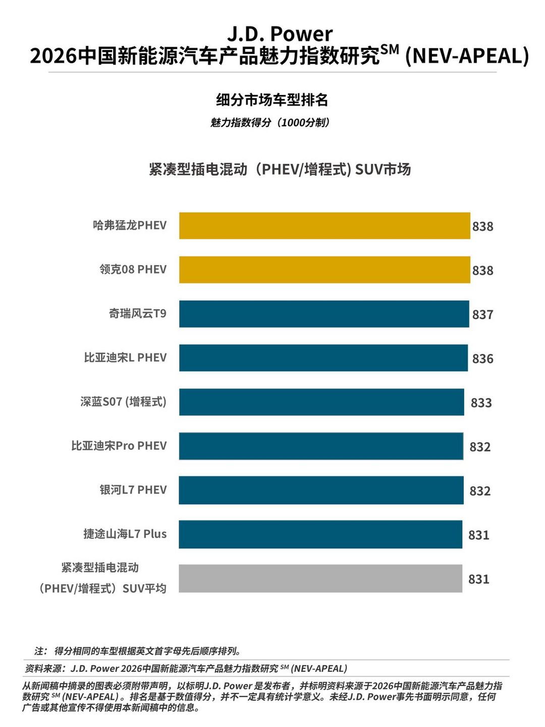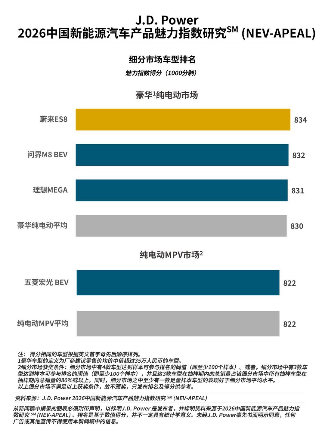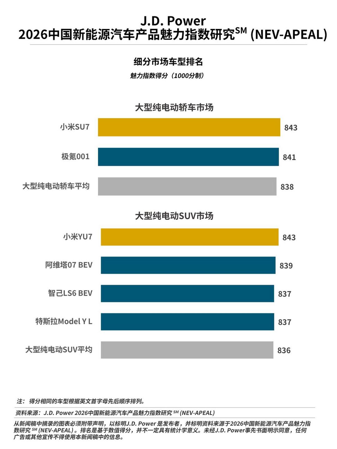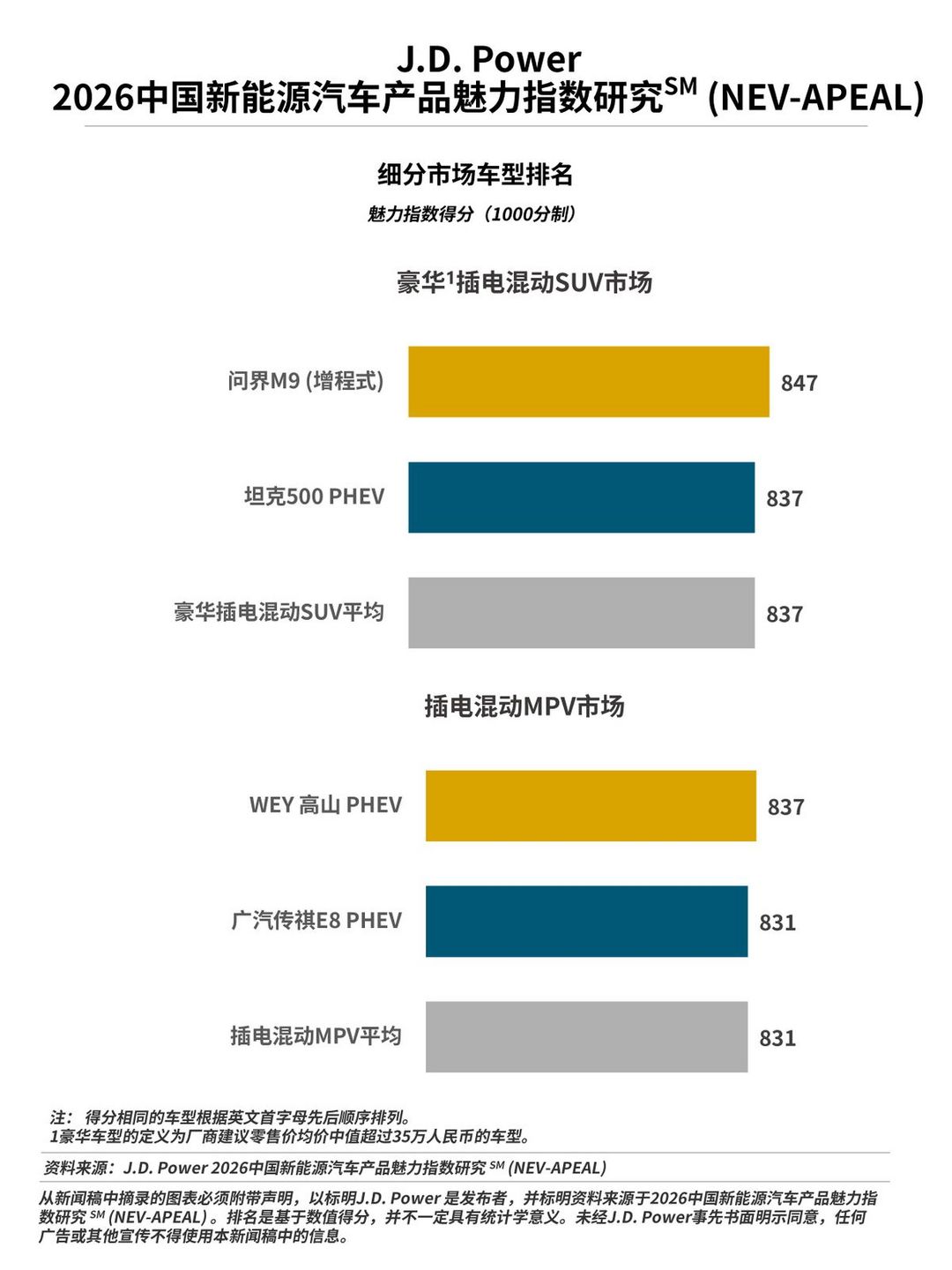 2026年細(xì)分市場(chǎng)調(diào)整說明:2026 J.D. Power (君迪) 新能源汽車產(chǎn)品魅力指數(shù)研究SM (NEV-APEAL) 中,大型純電動(dòng)細(xì)分市場(chǎng)的覆蓋車型由2025年的8款增至15款,從而支持該細(xì)分市場(chǎng)市場(chǎng)按照車身類型進(jìn)一步拆分;同時(shí),由于小型純電動(dòng)細(xì)分市場(chǎng)僅覆蓋1款SUV車型,因此該細(xì)分市場(chǎng)不再按照車身類型拆分;緊湊型插電混動(dòng)SUV市場(chǎng)僅覆蓋了2款增程式車型,因此該細(xì)分市場(chǎng)也不再按照能源類型拆分;插電混動(dòng)MPV細(xì)分市場(chǎng)僅覆蓋2款豪華車型,因此該細(xì)分市場(chǎng)也不再按價(jià)格拆分。由此, J.D. Power (君迪)新能源汽車細(xì)分市場(chǎng)由2025年的18個(gè)縮減至2026年的16個(gè)?;谝陨献兓?,此報(bào)告中不展示2025年小型純電動(dòng)轎車、小型純電動(dòng)SUV、大型純電動(dòng)、緊湊型插電混動(dòng)(PHEV)SUV、緊湊型插電混動(dòng)(增程式)SUV、豪華插電混動(dòng)MPV及主流插電混動(dòng)MPV細(xì)分市場(chǎng)的排名情況。 ↑