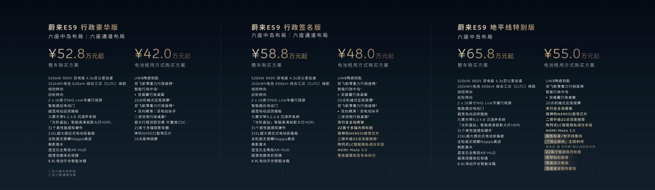 (4月9日,杭州)科技行政旗艦SUV——蔚來ES9今天在杭州正式發(fā)布并開啟預(yù)售。ES9是蔚來十一年體系創(chuàng)新的集大成之作,是智能電動(dòng)行政旗艦SUV品類的開創(chuàng)者。ES9行政豪華版預(yù)售價(jià)528,000元起,采用BaaS電池租用方式購(gòu)買,預(yù)售價(jià)420,000元起;行政簽名版預(yù)售價(jià)588,000元起,采用BaaS電池租用方式購(gòu)買,預(yù)售價(jià)480,000元起,地平線特別版預(yù)售價(jià)658,000元起,采用BaaS電池租用方式購(gòu)買,預(yù)售價(jià)550,000元起。