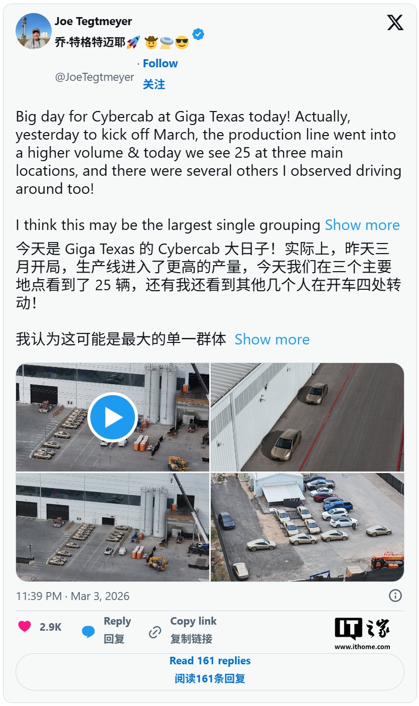 3月3日,無人機(jī)飛手JoeTegtmeyer在社交平臺上分享了一段航拍視頻,揭示了特斯拉得州工廠正在加速測試生產(chǎn)其