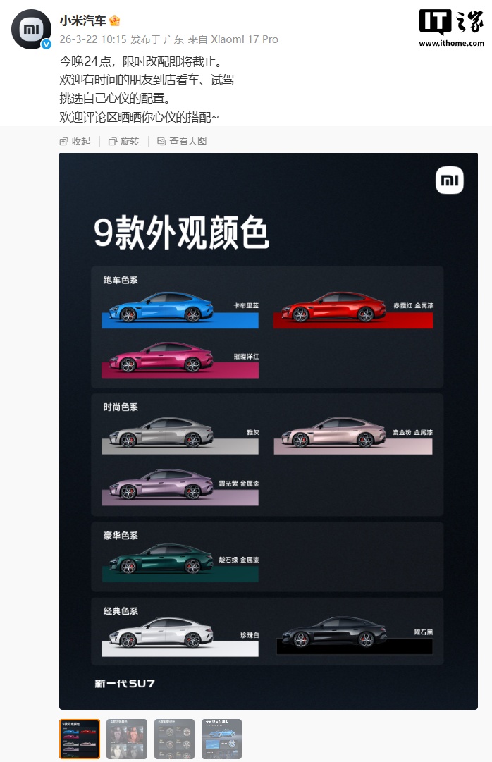 3月22日,小米汽車宣布新一代SU7的限時改配活動將于今晚24點結(jié)束。新一代SU7以其4大色系9款外飾顏色和經(jīng)典家族化設(shè)計受到關(guān)注,內(nèi)飾經(jīng)過重新設(shè)計,配備三層環(huán)繞式氛圍燈和Nappa真皮包覆的運動方向盤。車載智能冰箱升級,支持寬溫制冷制熱,音響系統(tǒng)也得到提升,Max版配備25揚聲器豪華音響系統(tǒng)。座椅配置豐富,主駕標配18向可調(diào)運動座椅,副駕和后排座椅均提供高級舒適配置。