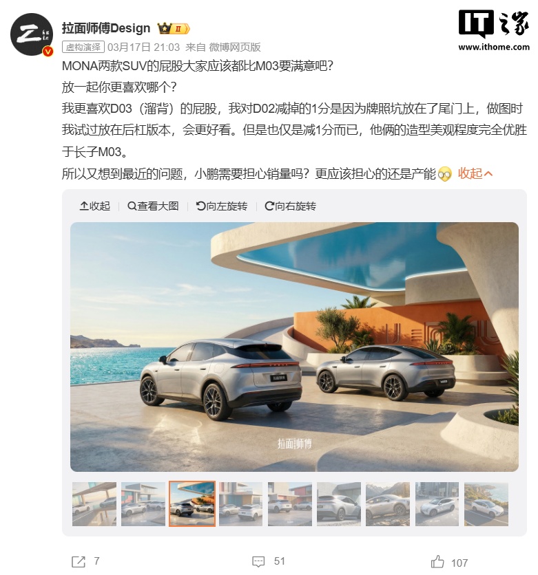 博主@拉面師傅Design表示,MONAD03不會(huì)是M03的簡單拉高版本,而MONAD02預(yù)計(jì)將是一款傳統(tǒng)造型的SUV,與D03在外觀上存在較大差異。此外,@拉面師傅Design還發(fā)布了兩款車型的假想圖。此前,小鵬汽車董事長何小鵬曾表示,MONA系列將推出多款車型,產(chǎn)品將實(shí)現(xiàn)全球化,包括左舵、右舵、純電、超電等多種配置,強(qiáng)調(diào)全球化戰(zhàn)略應(yīng)是長線發(fā)展,與本地市場共贏。