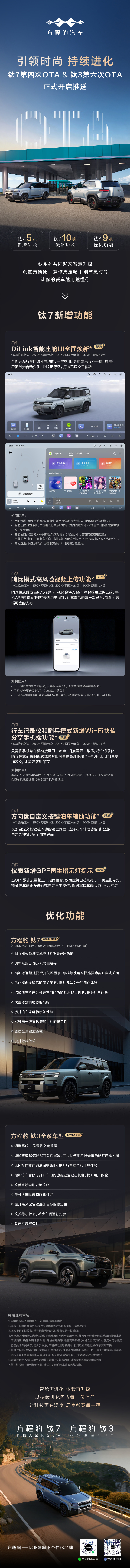今日,比亞迪方程豹宣布,鈦7和鈦3車型的OTA更新正式開啟推送。鈦7迎來第四次OTA更新,新增了DiLink智能座艙UI全面煥新、哨兵模式高風險視頻上傳功能、行車記錄儀和哨兵模式新增Wi-Fi快傳分享手機端功能等多項功能。此外,鈦7還優(yōu)化了哨兵模式的本地或U盤便捷導出功能,調整了系統(tǒng)UI顯示及文言提示,增加了彎道超速提醒開關設置項,優(yōu)化了橫向變道路沿保護策略,提升了行車安全和用戶體驗。