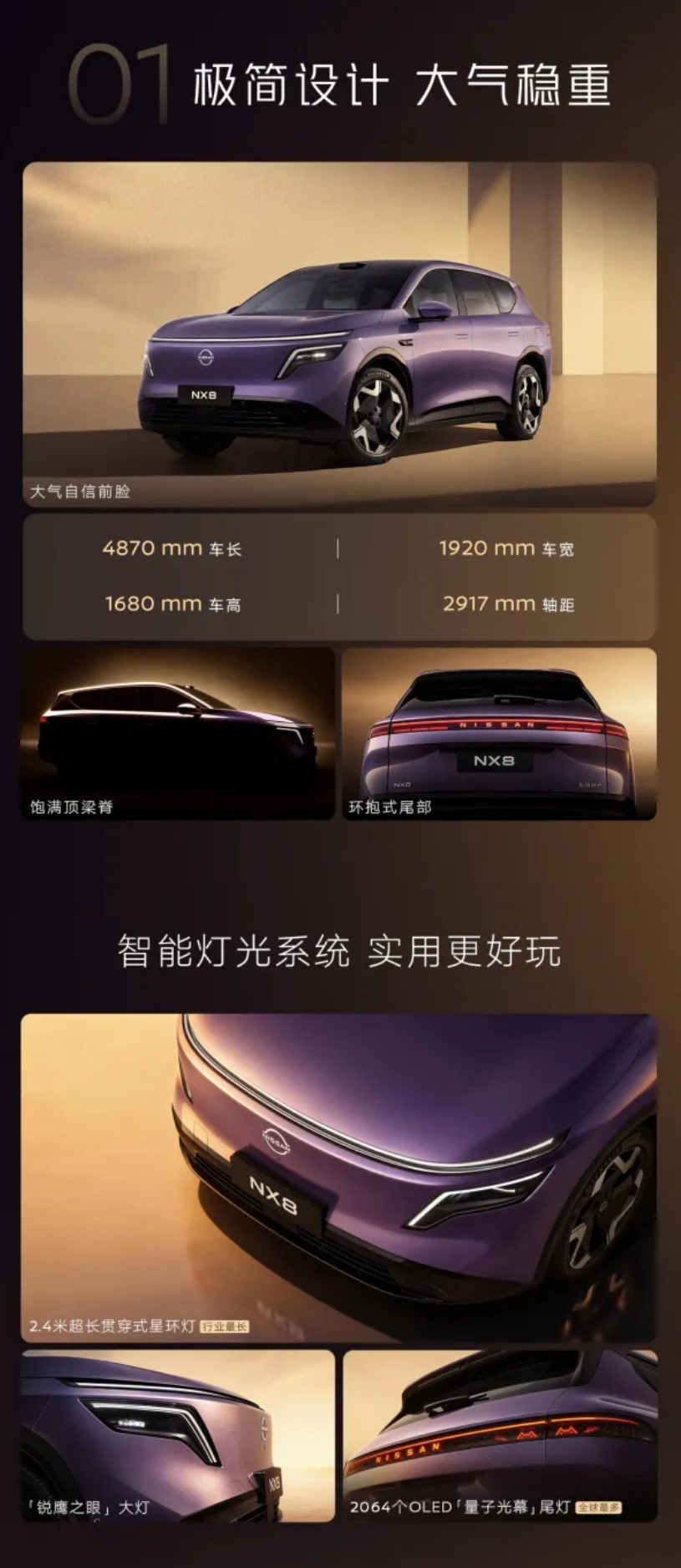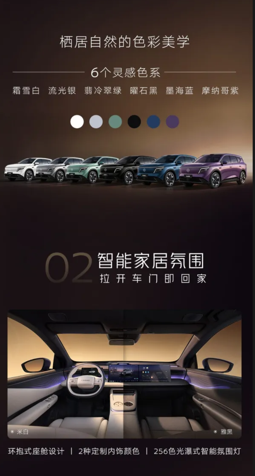 電池,支持5C超快充技術(shù)。車身尺寸為4870*1920*1680mm,軸距2917mm,前臉配備2.4米超長貫穿式星環(huán)燈,后尾帶有2064個OLED量子光幕尾燈。外觀提供六種配色,由東風日產(chǎn)、寧德時代、momenta聯(lián)合打造,A柱配備2000MPa鋼材,全車超70%裝備高強鋼。車內(nèi)有效高度1285mm,擁有95L前備箱、773L雙層后備箱,后排角度133°,全車40點SPA級按摩,25揚聲器環(huán)繞音響支持杜比全景聲。搭載雙15.6英寸聯(lián)屏、10.25英寸儀表屏,配備冷暖雙用冰箱。高通8295P芯片和AI語音助手Nico,配備momenta智駕,搭載29個高感知傳感器,22項主動安全功能,支持城市領(lǐng)航NOA、高速領(lǐng)航NOA及泊車輔助。