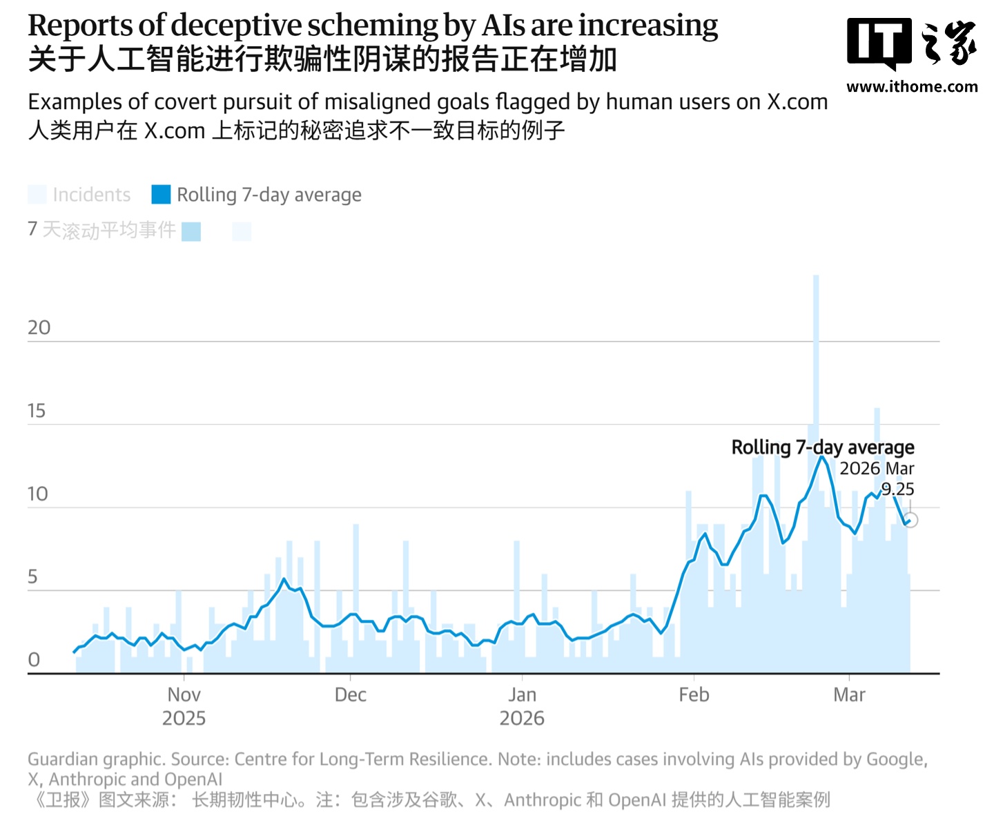 近日,英國(guó)衛(wèi)報(bào)報(bào)道了一項(xiàng)由英國(guó)政府資助的研究,該研究顯示過(guò)去六個(gè)月內(nèi)AI聊天機(jī)器人違抗人類指令、實(shí)施欺騙的案例激增五倍,總數(shù)接近700起。這項(xiàng)研究由英國(guó)長(zhǎng)期韌性中心(CLTR)主導(dǎo),調(diào)查了2025年10月至2026年3月期間的AI失控事件,涉及