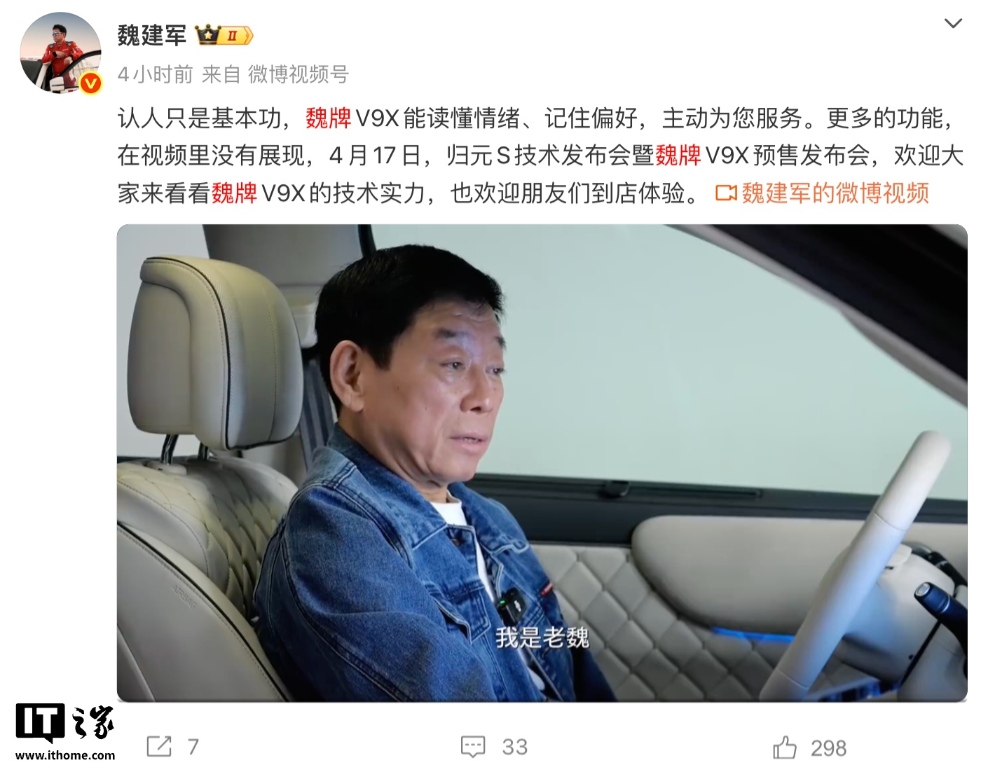 4月13日,長城汽車董事長魏建軍通過微博宣布,歸元S技術(shù)發(fā)布會(huì)暨魏牌V9X預(yù)售發(fā)布會(huì)將于4月17日舉行。魏牌V9X定位為“AI豪華六座旗艦”,搭載“超級(jí)Hi4”混動(dòng)技術(shù)架構(gòu),提供240km與363km兩種純電續(xù)航里程版本。歸元S平臺(tái)是長城魏牌推出的原生AI全動(dòng)力技術(shù)平臺(tái),基于OMS+VLM雙感知系統(tǒng)和LoffeeEEA4.0電子電氣架構(gòu),旨在打造具備“車輛識(shí)人、記事、懂情緒”能力的AI智能體座艙與整車系統(tǒng)。