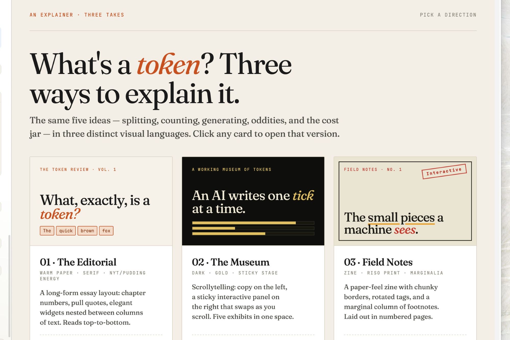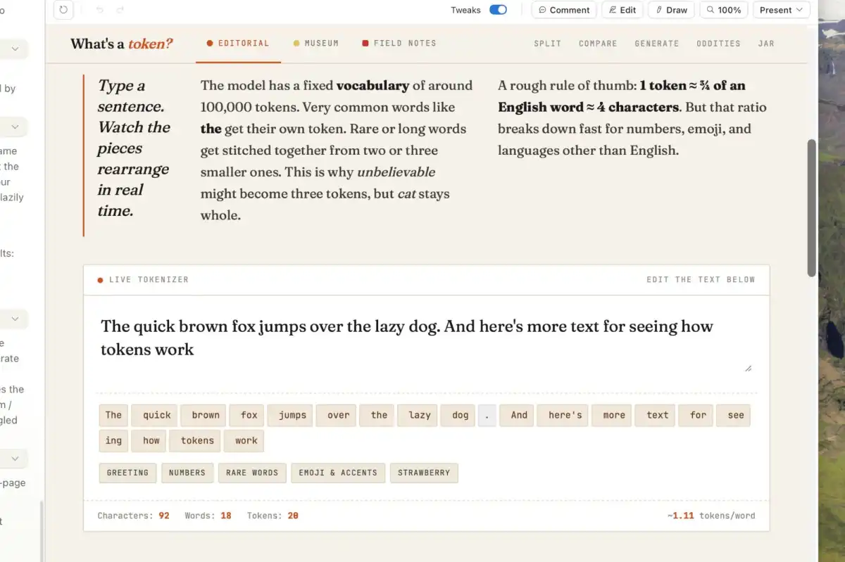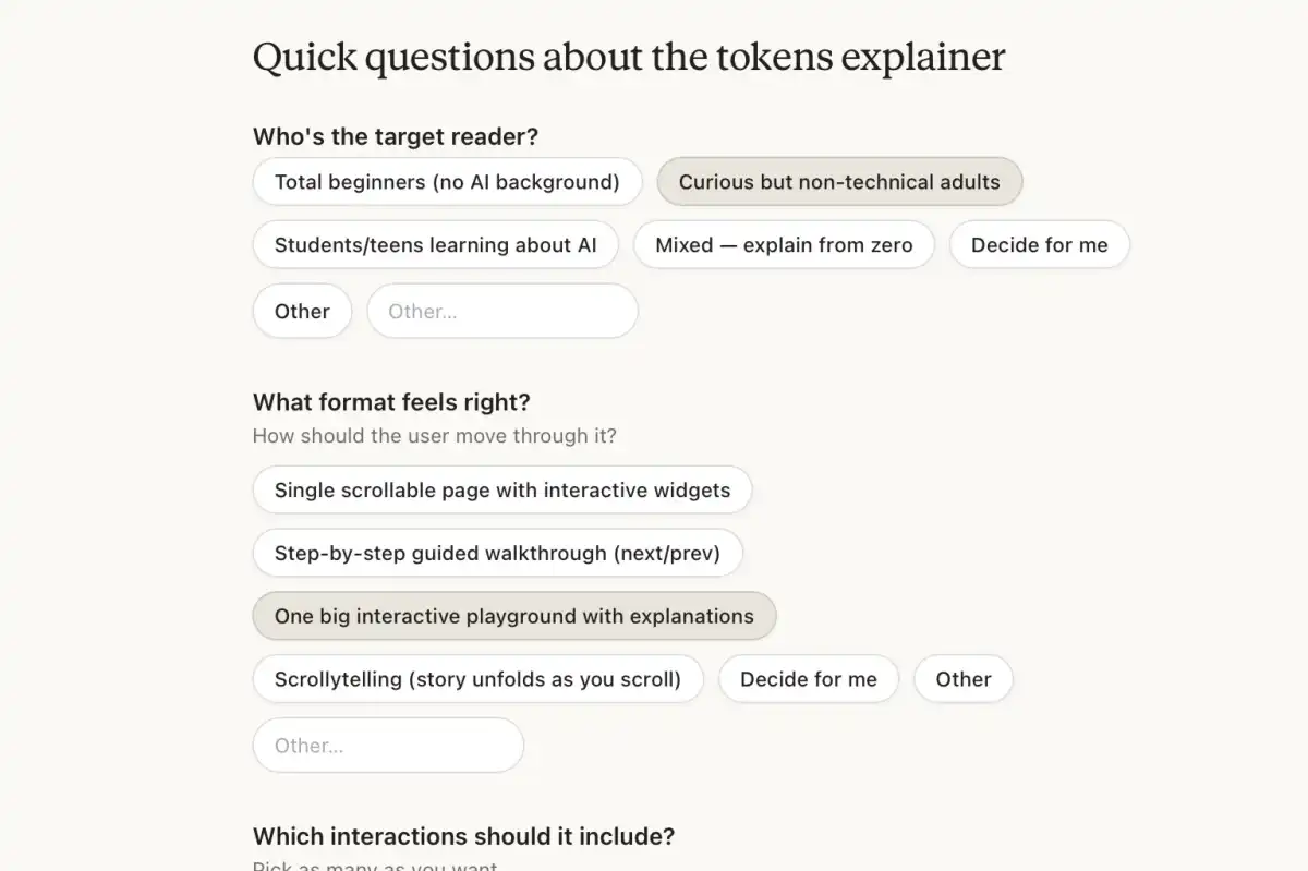 編輯本·帕特森(Ben Patterson)通過輸入“創(chuàng)建解釋AIToken的交互圖表”的提示,ClaudeDesign通過多輪問答明確需求后,迅速制定了設(shè)計方案。工具界面采用左右分欄布局,左側(cè)為對話欄,右側(cè)為實時畫布。在5分鐘內(nèi),系統(tǒng)便生成了包含實時交互功能的網(wǎng)頁草稿,文案清晰準(zhǔn)確,基本符合預(yù)期。在25分鐘內(nèi),工具完成了3個版本的原型設(shè)計。